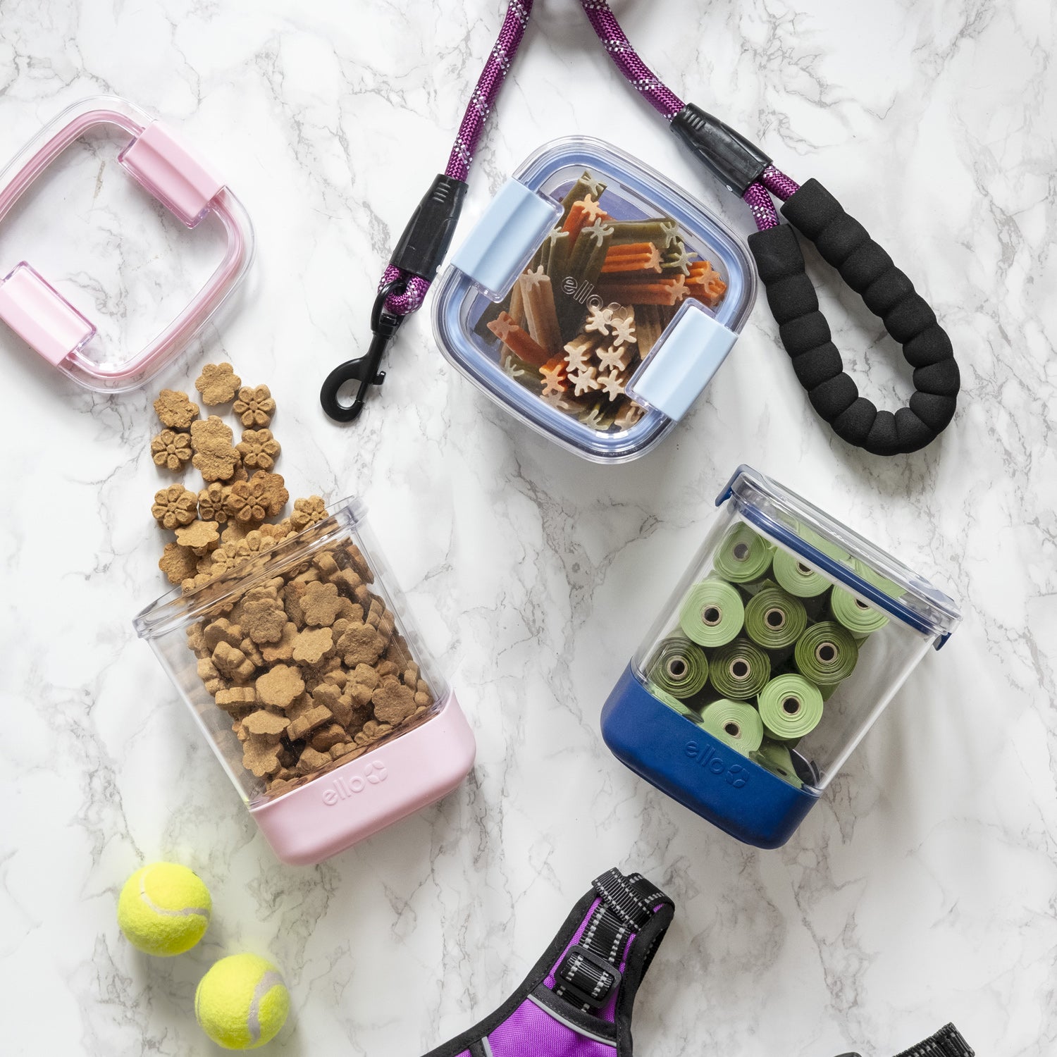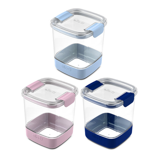 Get organized with Ello 3pc Food Storage Canister Set. This canister is designed to stay put when stacked due to its protective silicone boot and modular design. The airtight lid locks food in to keep it fresh, so it's perfect for storing dry goods like bulk foods and baking ingredients. Keep any cupboard organized with this space-efficient design, and scoop and pour with ease due to its wide opening and round corners.