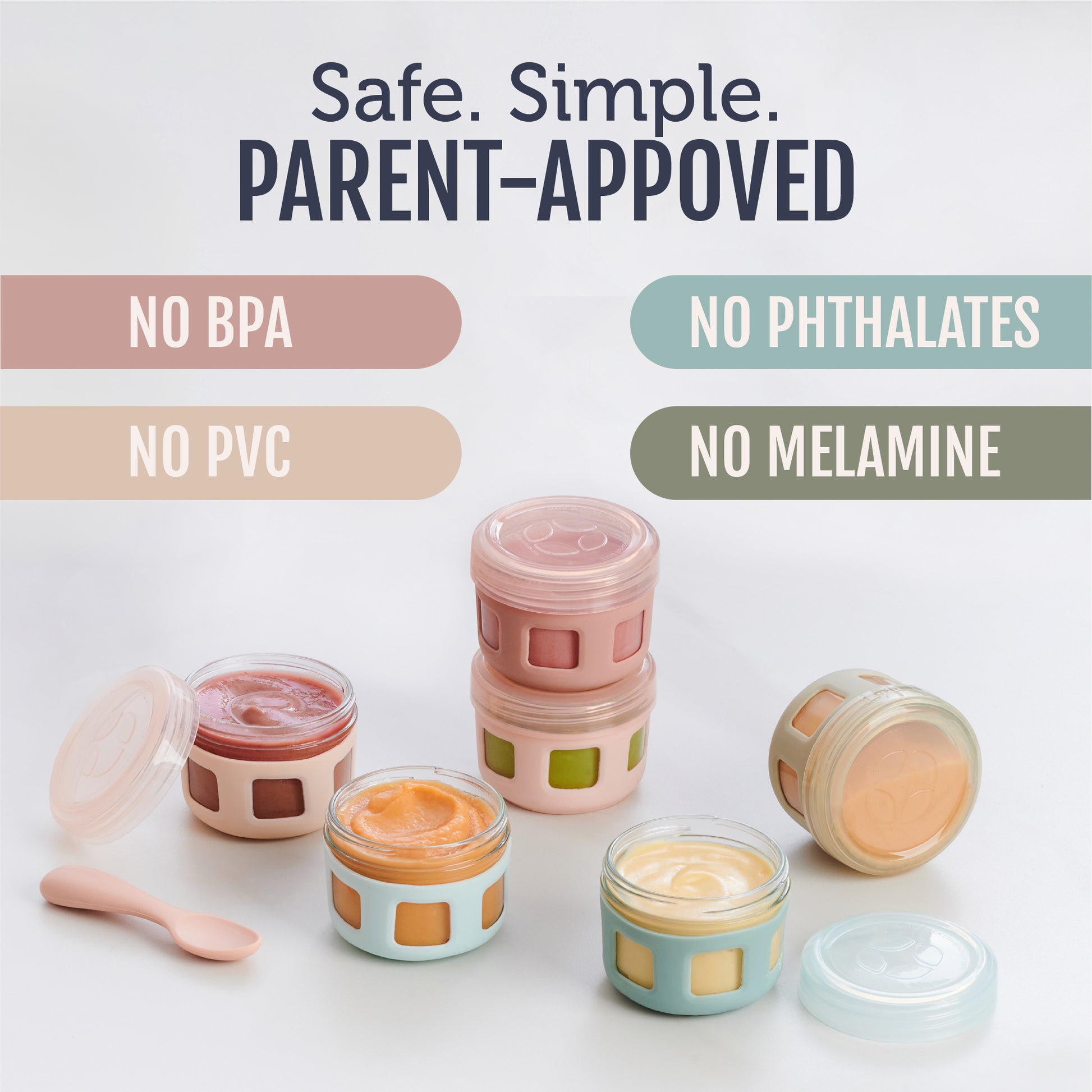 The Ello Clean Start Glass Baby Food Containers are built for parents who want peace of mind with every spoonful. Each 4oz jar is made from durable glass with a protective silicone sleeve and leak-proof lid, perfect for purees, soft snacks, and tiny portions at home or on the go. Free from forever chemicals, BPA, PVC, phthalates, and melamine. Safe to freeze, microwave (without lid), and toss in the dishwasher. Clean feeding made simple.