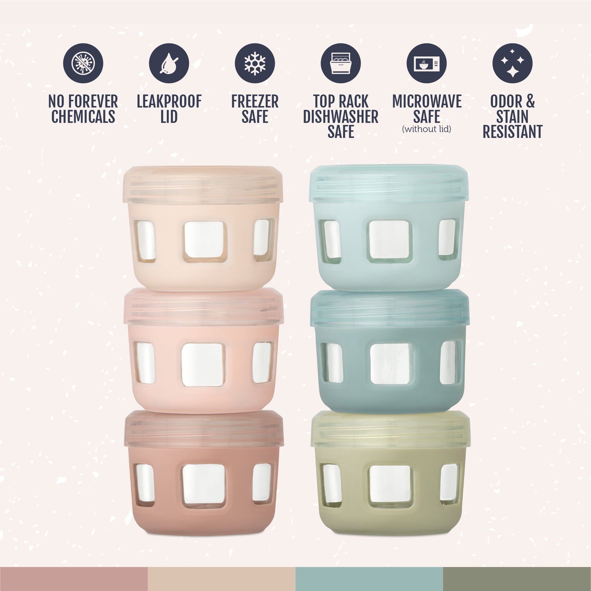 WHAT’S INCLUDED: Set of six 4oz glass jars with silicone sleeves and leak-proof lids for babies and toddlers.
