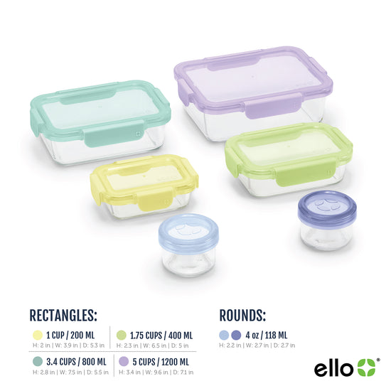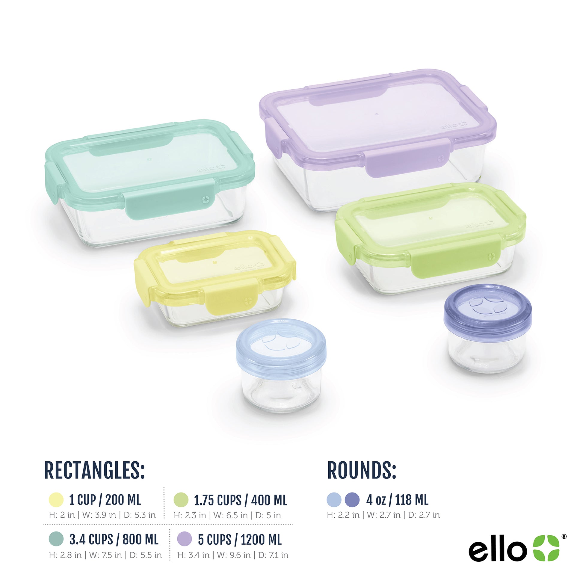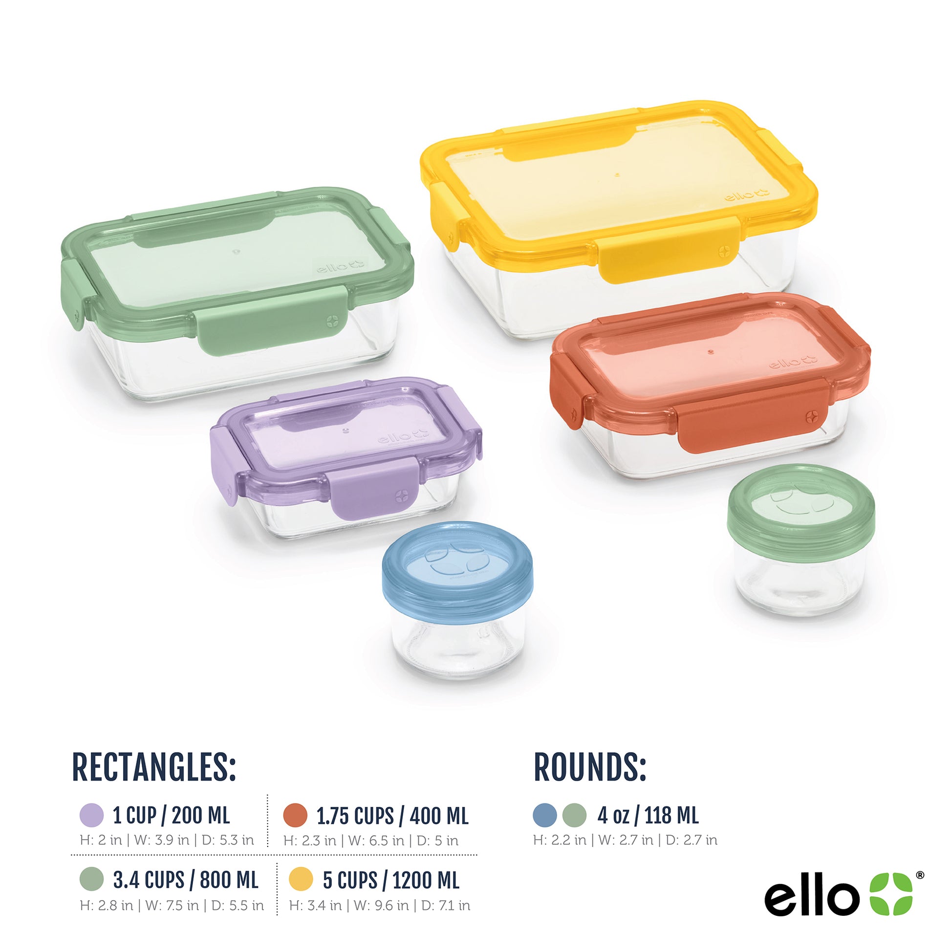 Ello Duraglass™ Color Lock® 12pc Meal Prep Food Storage Containers includes (1) 5 cup glass food container, (1) 3.4 cup glass food container, (1) 1.75 cup glass food container, (1) 1 cup glass food container, (2) glass condiment containers and (6) BPA-free plastic locking lids to keep food fresh for longer.