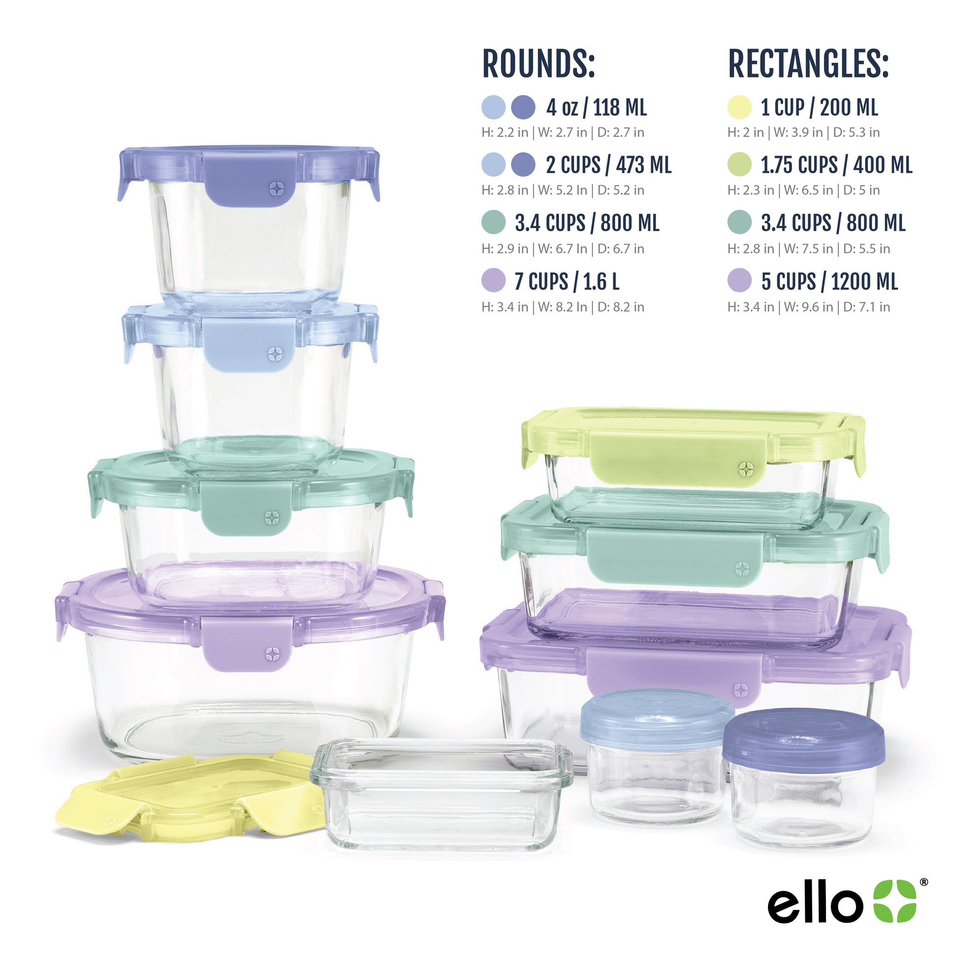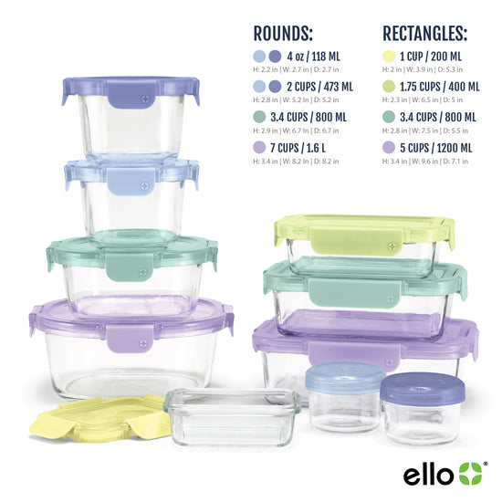 Ello Duraglass™ Color Lock® 20pc Mixed Meal Prep Food Storage Containers gives you the convenience, ease, and peace of mind when packing lunches or meal prepping. Save time and money by storing leftovers or prepping the week's meals in this multi-size glass food storage set. There is a container for every one of your needs.