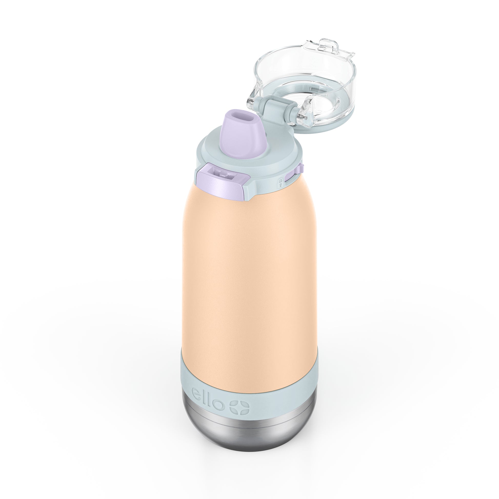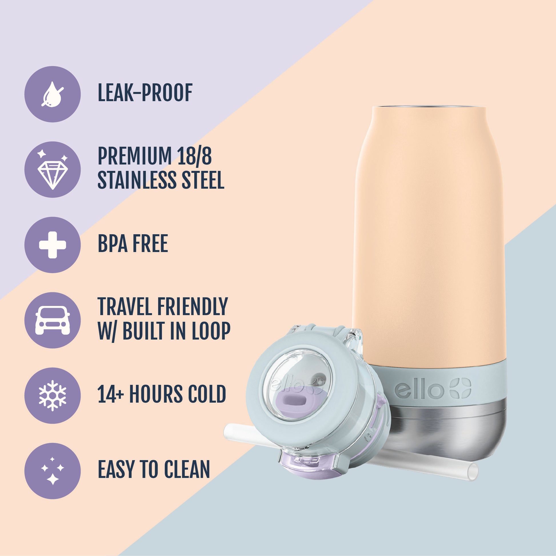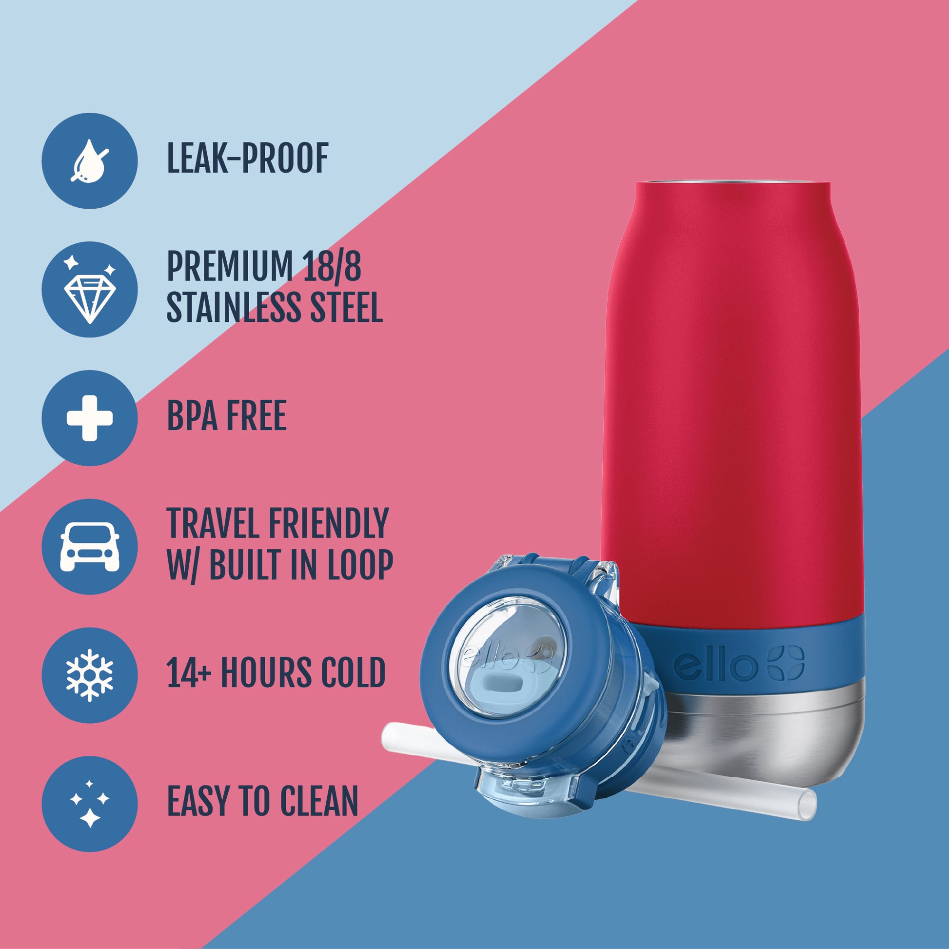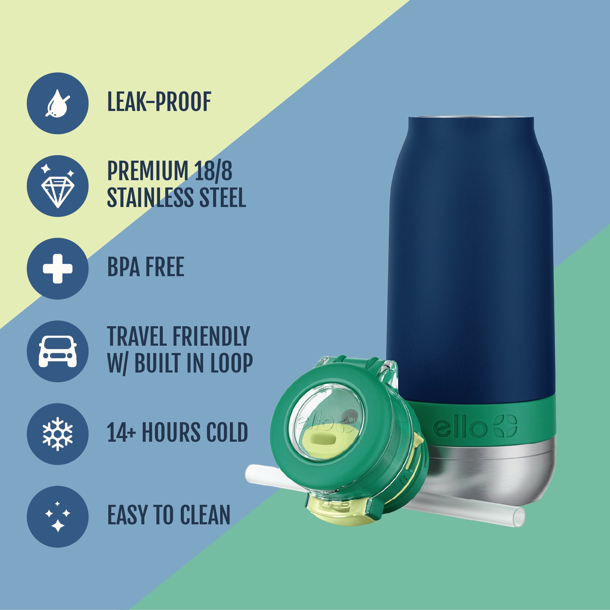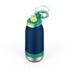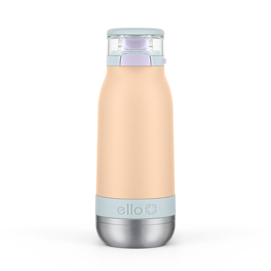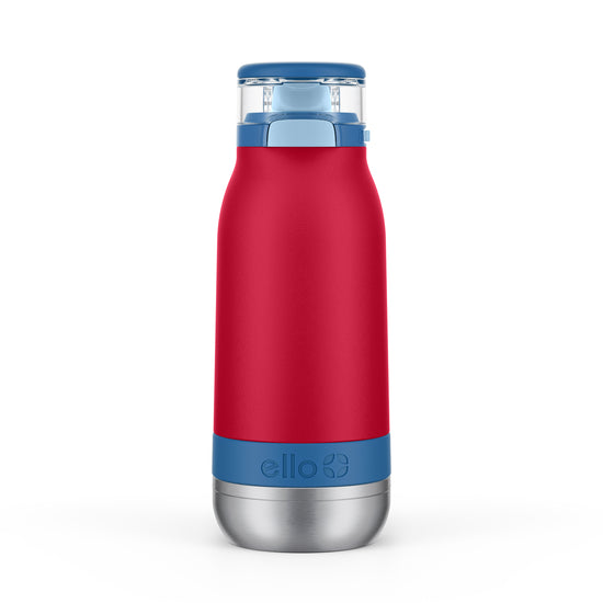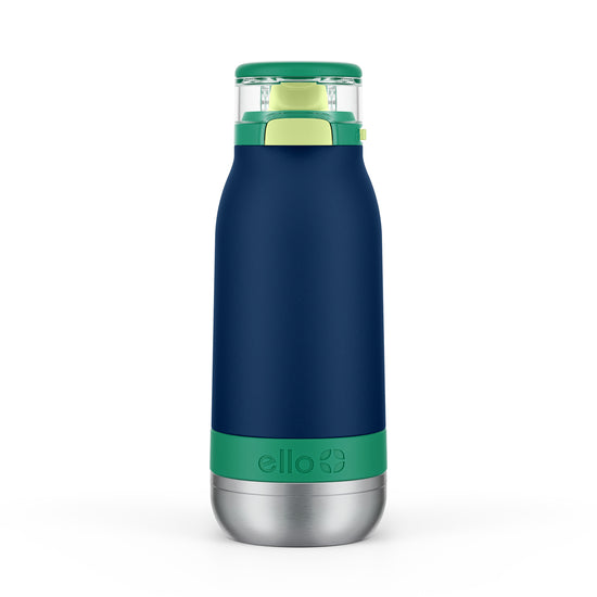 The Ello Emma 14oz vacuum insulated stainless steel kids water bottle keeps your little ones hydrated with cold-staying power. Vacuum insulated 18/8 stainless steel keeps beverages cold for 14+ hours. Emma's leak-proof locking flip lid features an XL push button for smaller hands and a fully-covered and yuck-free straw that minimizes spills. A built-in carry loop makes it super easy to stay hydrated on-the-go.
