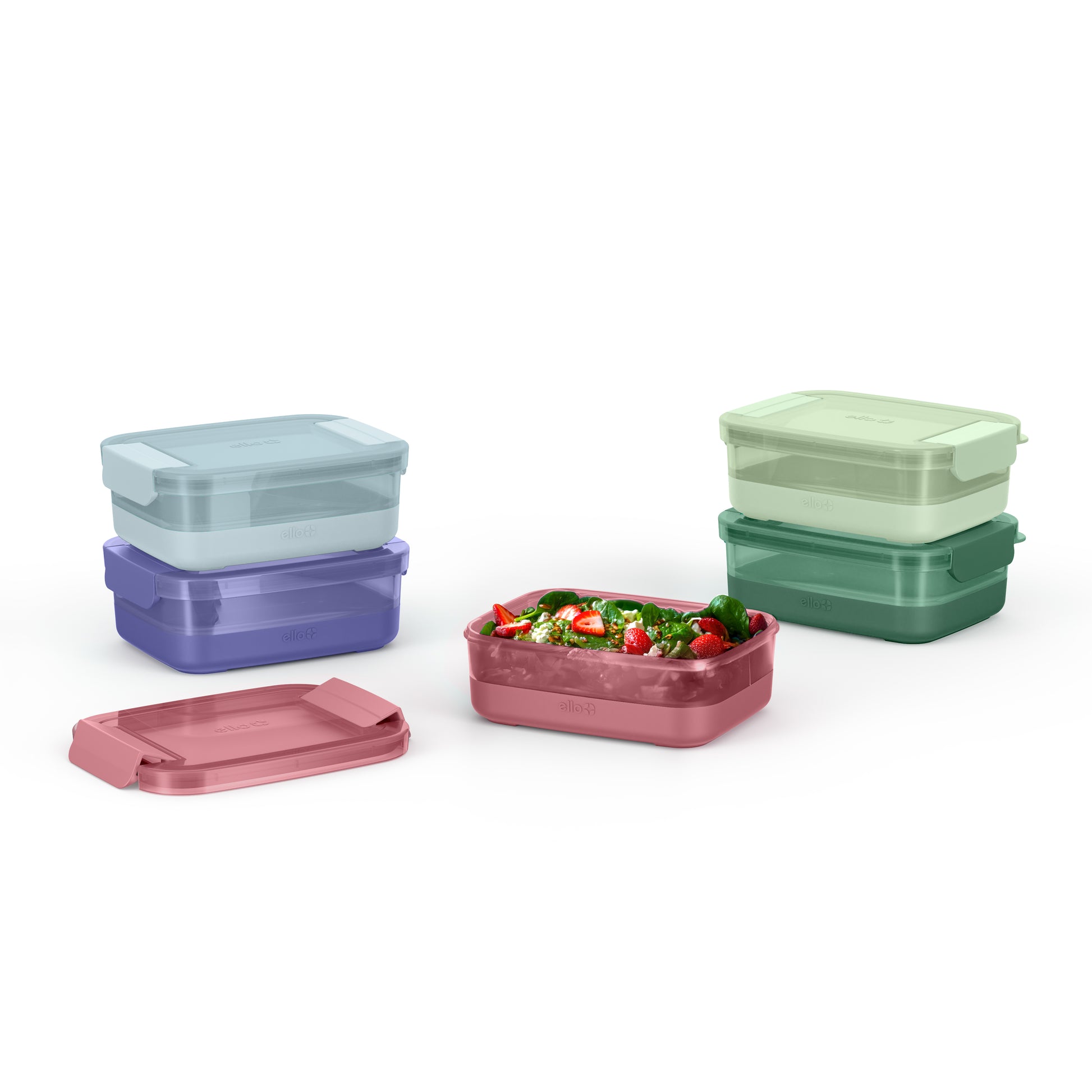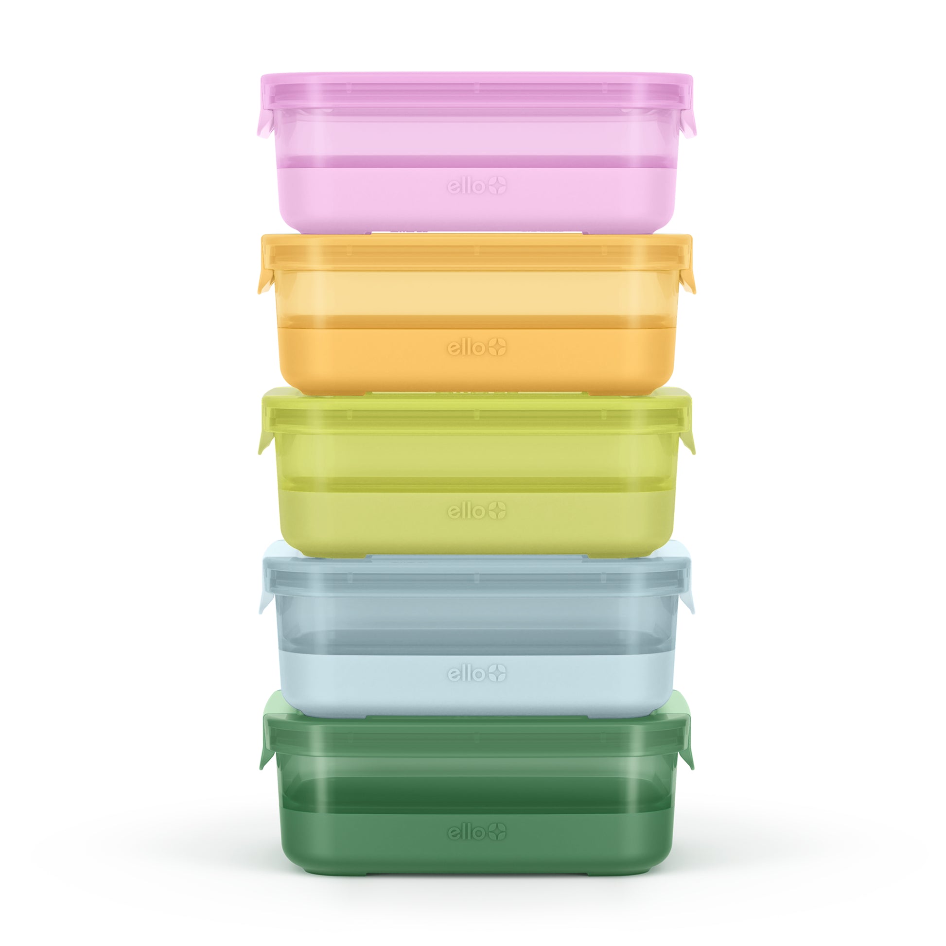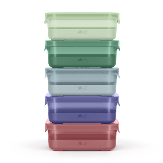 The Ello plastic food storage container set brings premium design details into plastic with bright, statement-making colors and matching lids. The set includes 5 food storage containers with silicone protective boots and 5 matching leak-proof lids. The variety of colors allow you to coordinate, show-off, and brighten up your meal prep routine or leftovers.